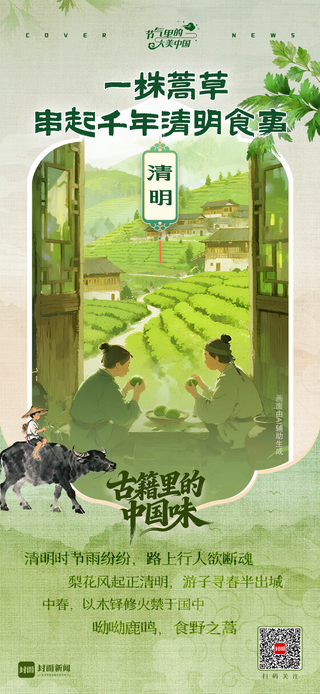 从《周礼》“中春,以木铎修火禁于国中”的寒食古制,到江南青团、四川艾蒿馍馍,中国人把追思、礼赞、热爱一同揉进这抹青绿。值得一提的是,《诗经》里的“呦呦鹿鸣,食野之蒿”不仅点出了古人采食野蒿的传统,还与科学家屠呦呦形成奇妙呼应——她的名字来自这句诗,而葛洪《肘后备急方》中“青蒿一握,以水二升渍,绞取汁”的记载,给了她发现青蒿素的关键灵感。一株蒿草,一头连着寒食古礼的烟火,一头通向现代科技的巅峰。